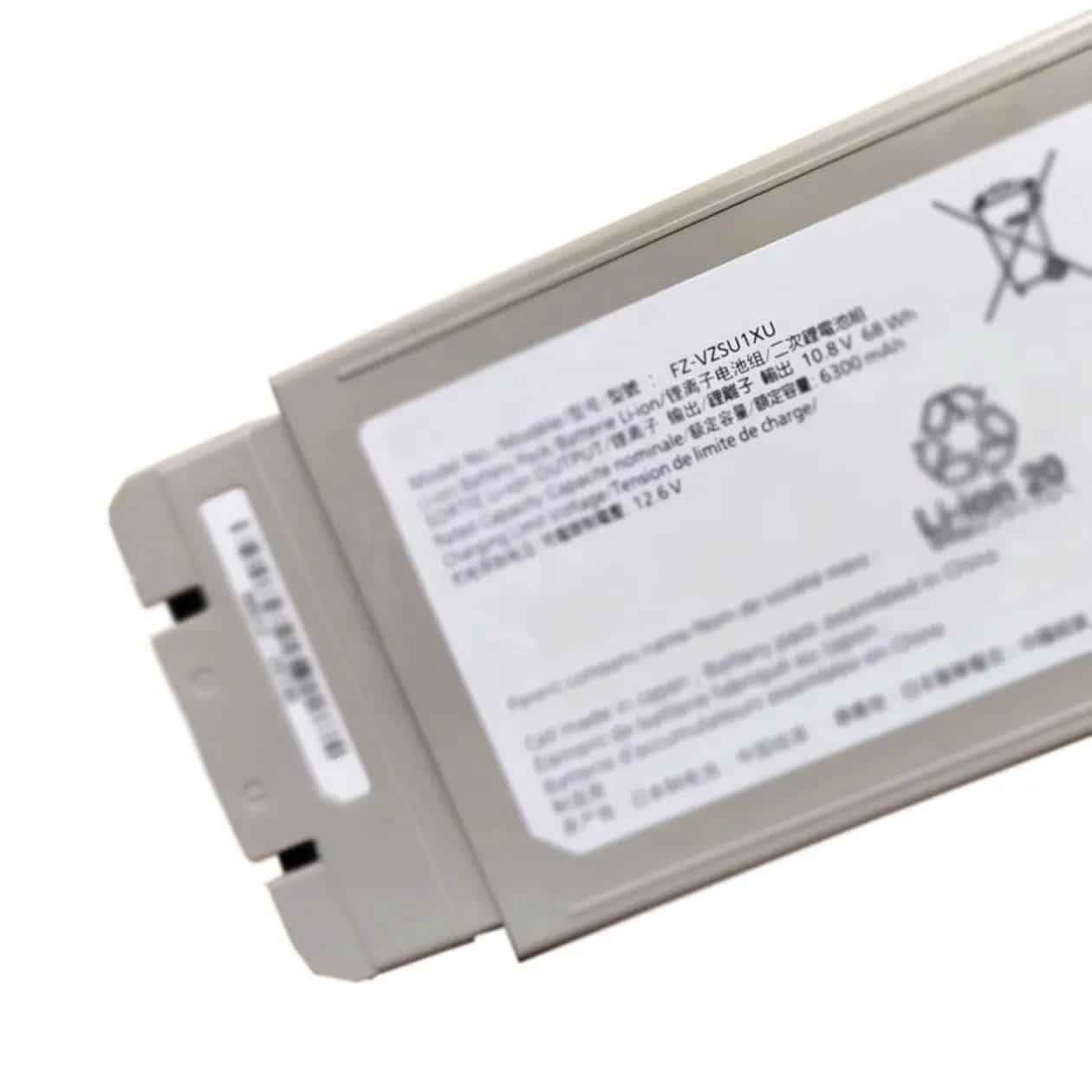 High-performance 10.8V 6300mAh (68Wh) Li-ion battery designed for Panasonic Toughbook 40 (models: FZ-40, FZ-40 MK1/MK2) and compatible with part number FZ-VZSU1XU. This CE/FCC-certified battery offers 12 hours of runtime under standard use (MobileMark 25) and charges fully in 3 hours when the device is off.